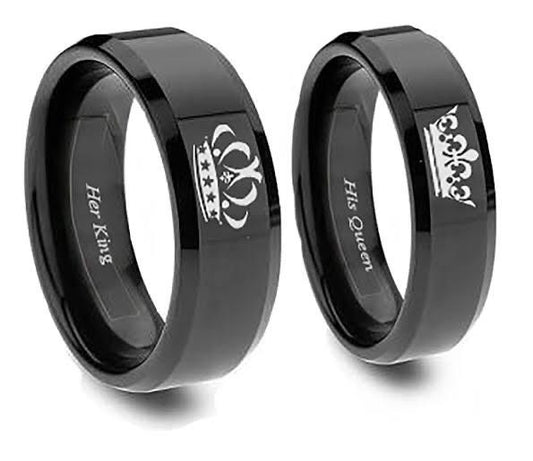 ANILLOS DE PAREJA HIS QUEEN HER KING GRABADOS CORONA NEGRO MATTE