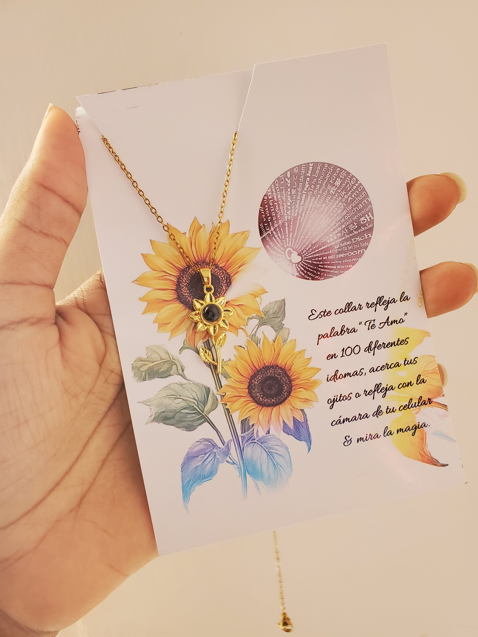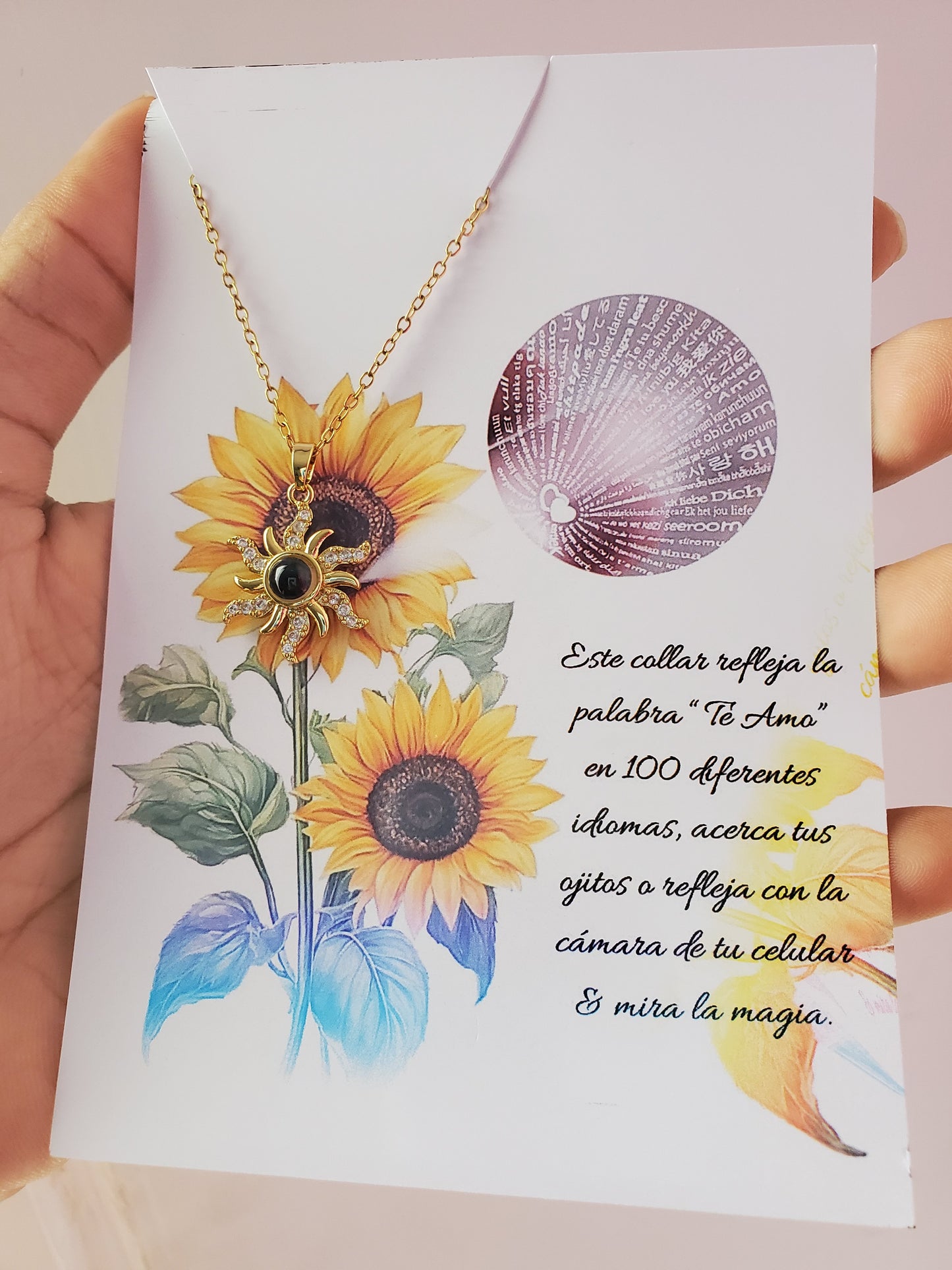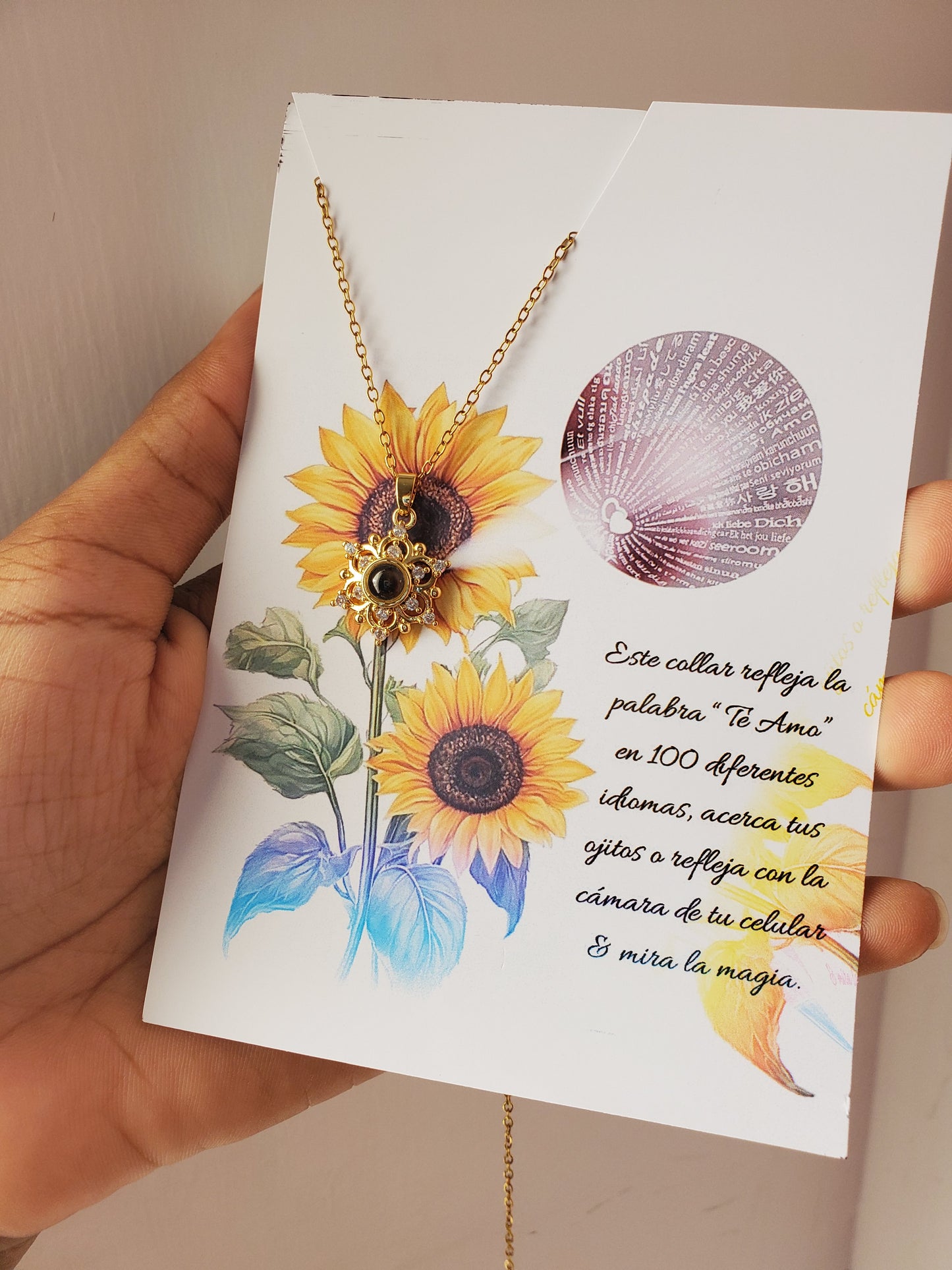 Si quieres demostrar cuanto la amas, con este regalo puedes expresarlo en muchos idiomas. ¡Usa la cámara de tu teléfono o la luz del flash y mira cómo el collar cobra vida!
