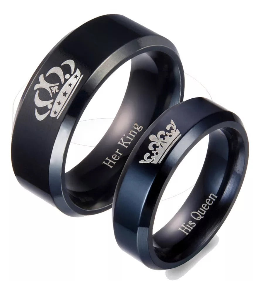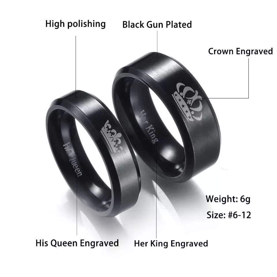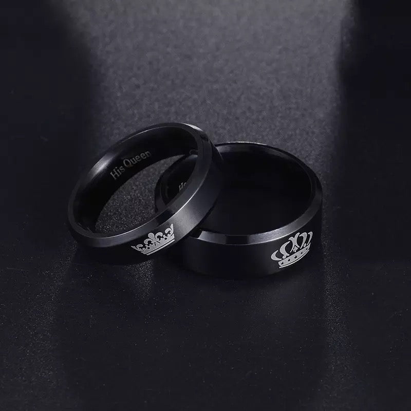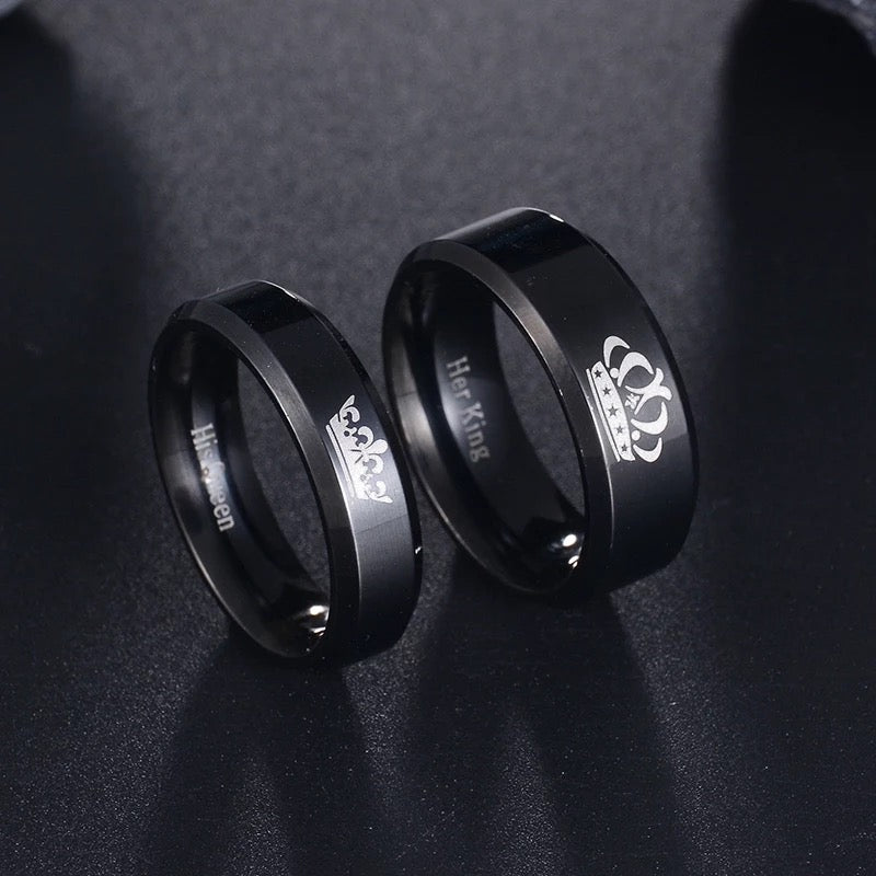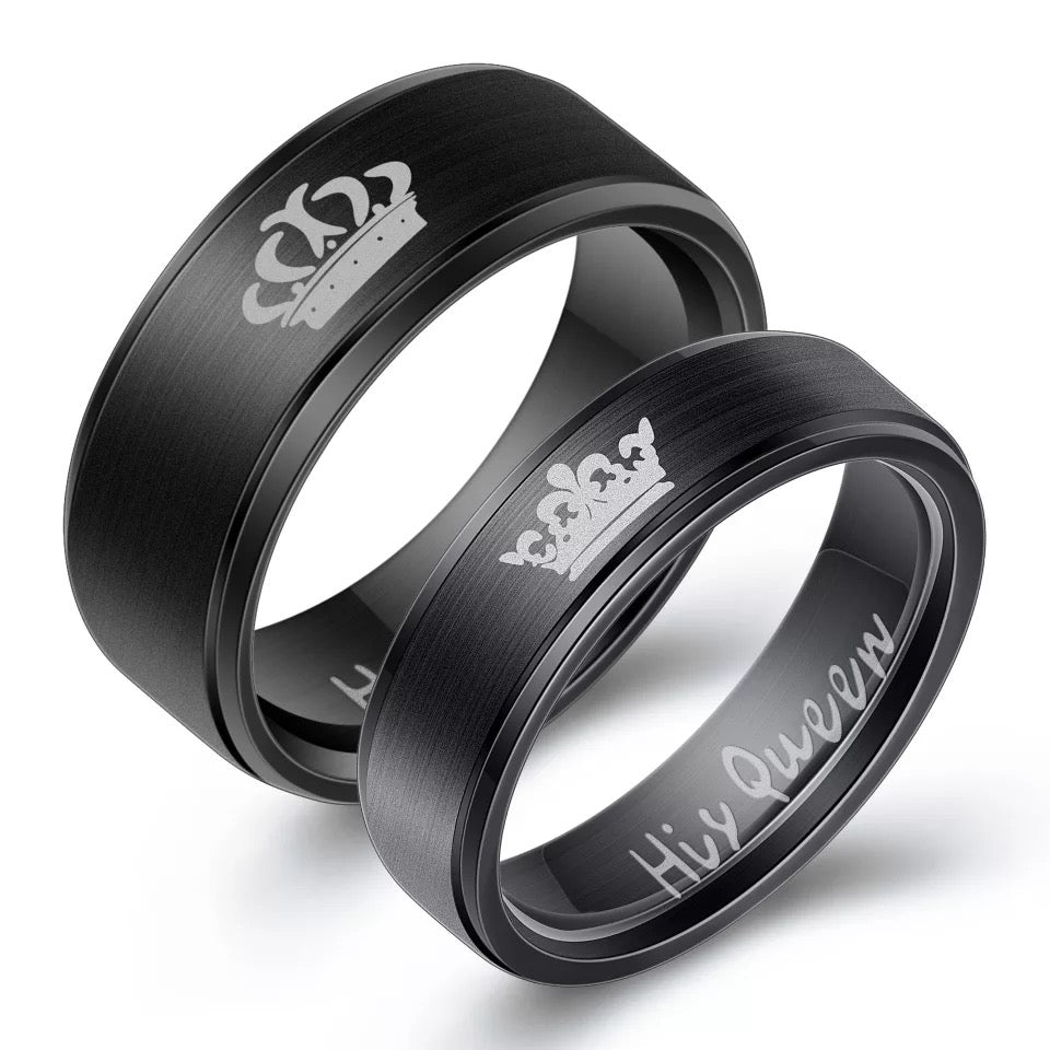 ANILLOS DE PAREJA HIS QUEEN HER KING GRABADOS CORONA NEGRO MATTE