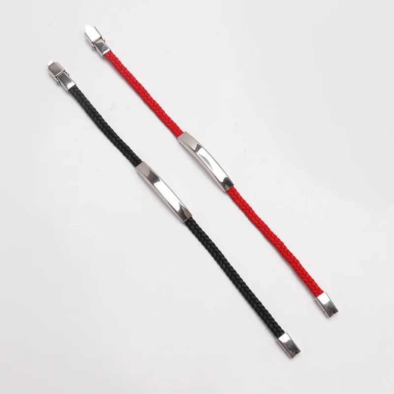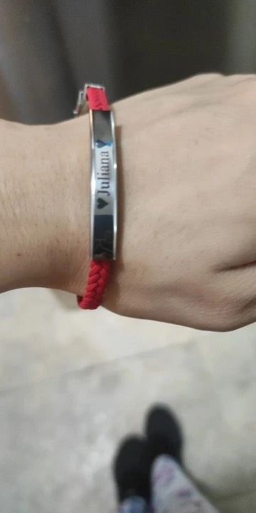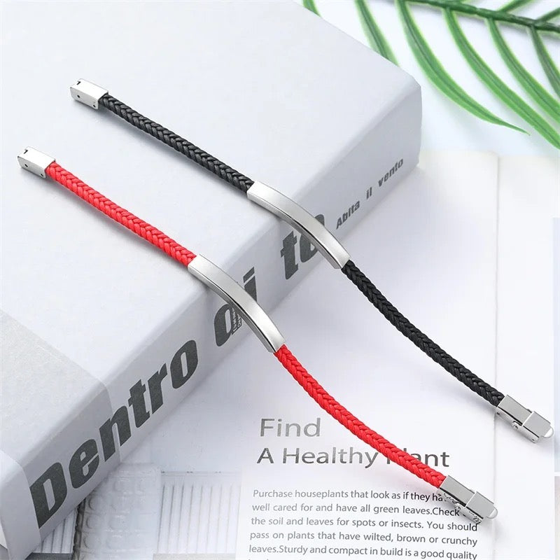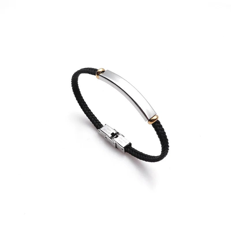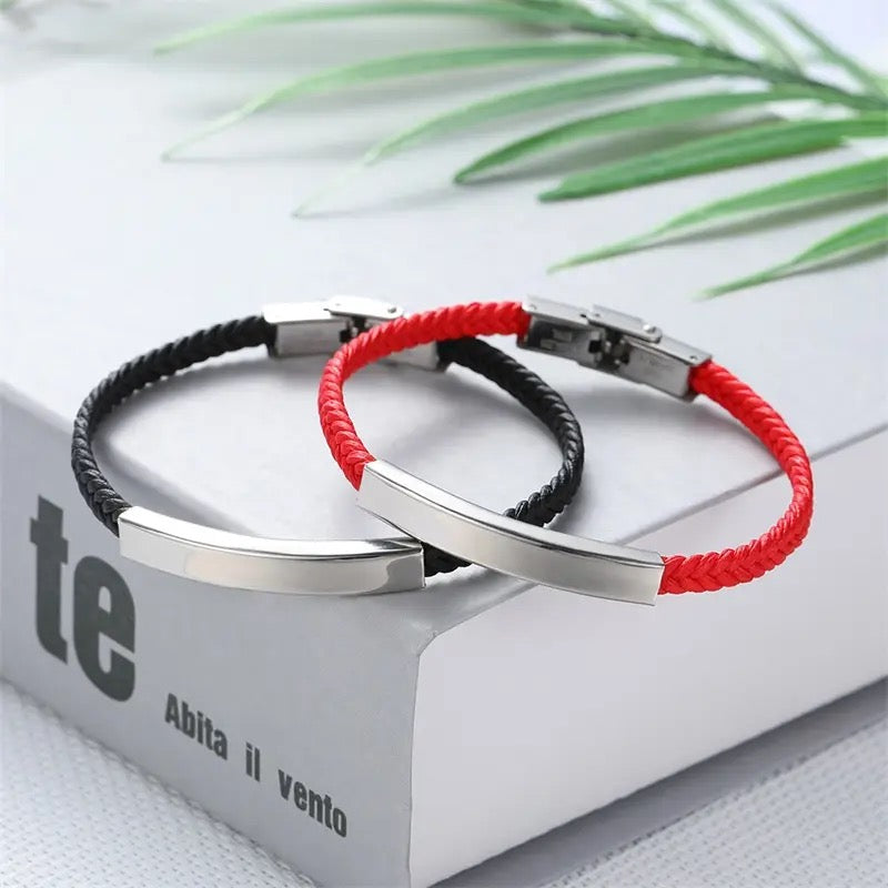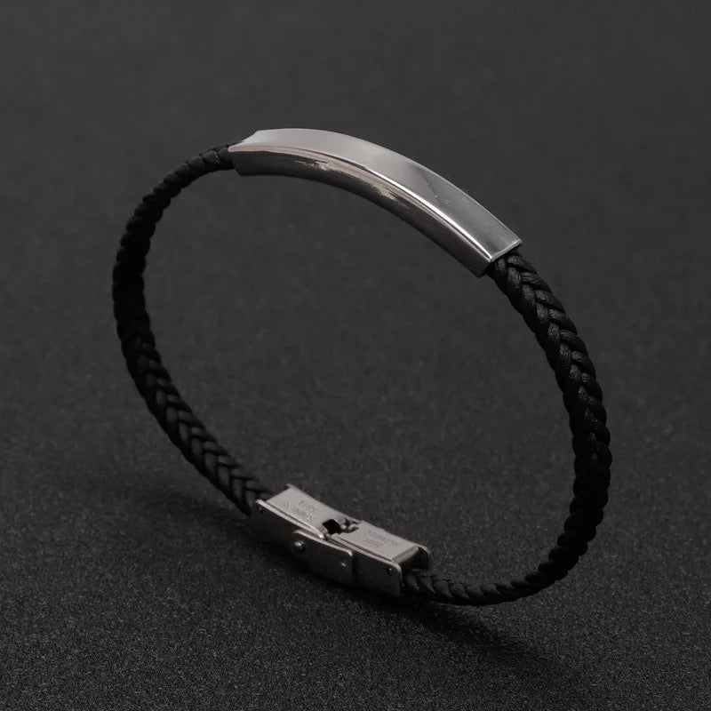 BRAZALETE FINO LEATHER TRENZADO PLACA MINIMALISTA DE ACERO LAMINADO PERSONALIZABLE