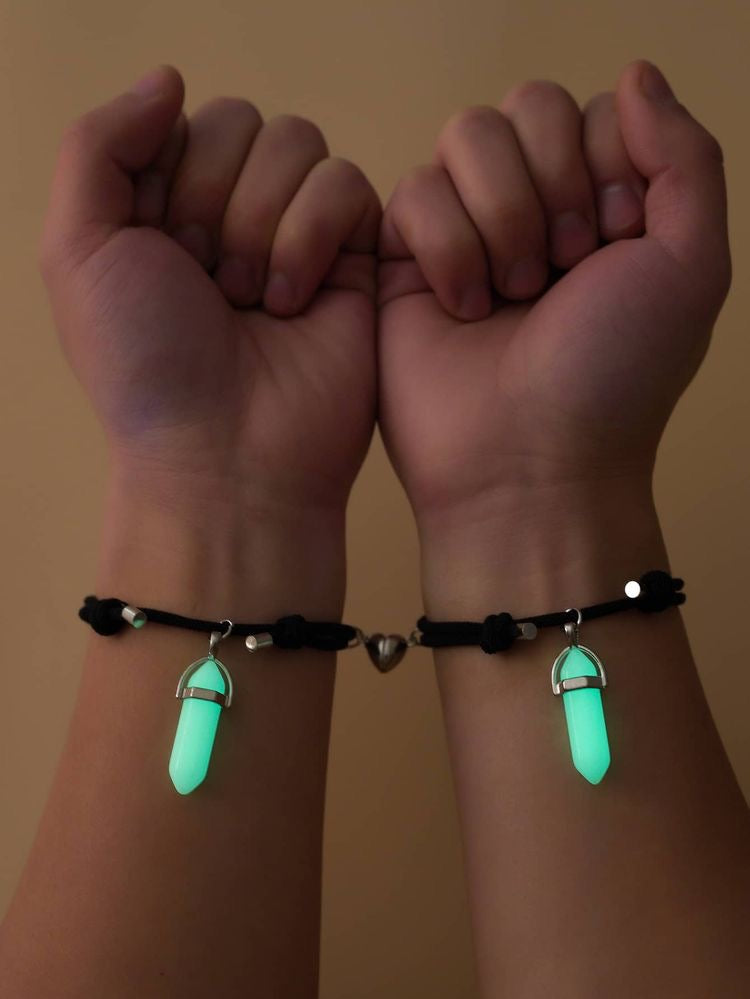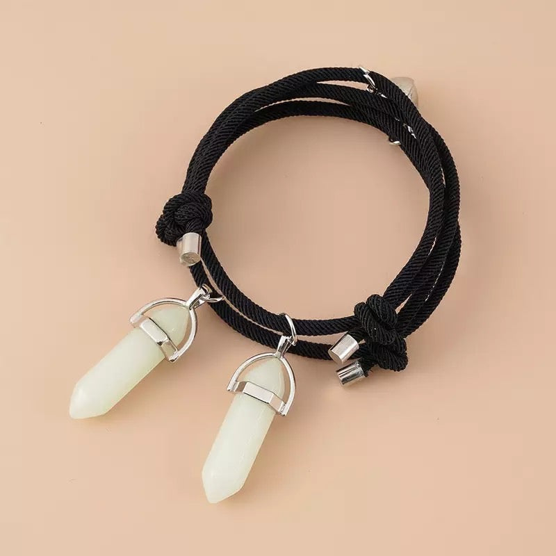 Descripción: ¡Brillan en la oscuridad! están elaborados en cuerda especial con propiedades luminiscentes, además, cuentan con un imán para juntar fuertemente ambos brazaletes al juntar la mano con tu pareja.