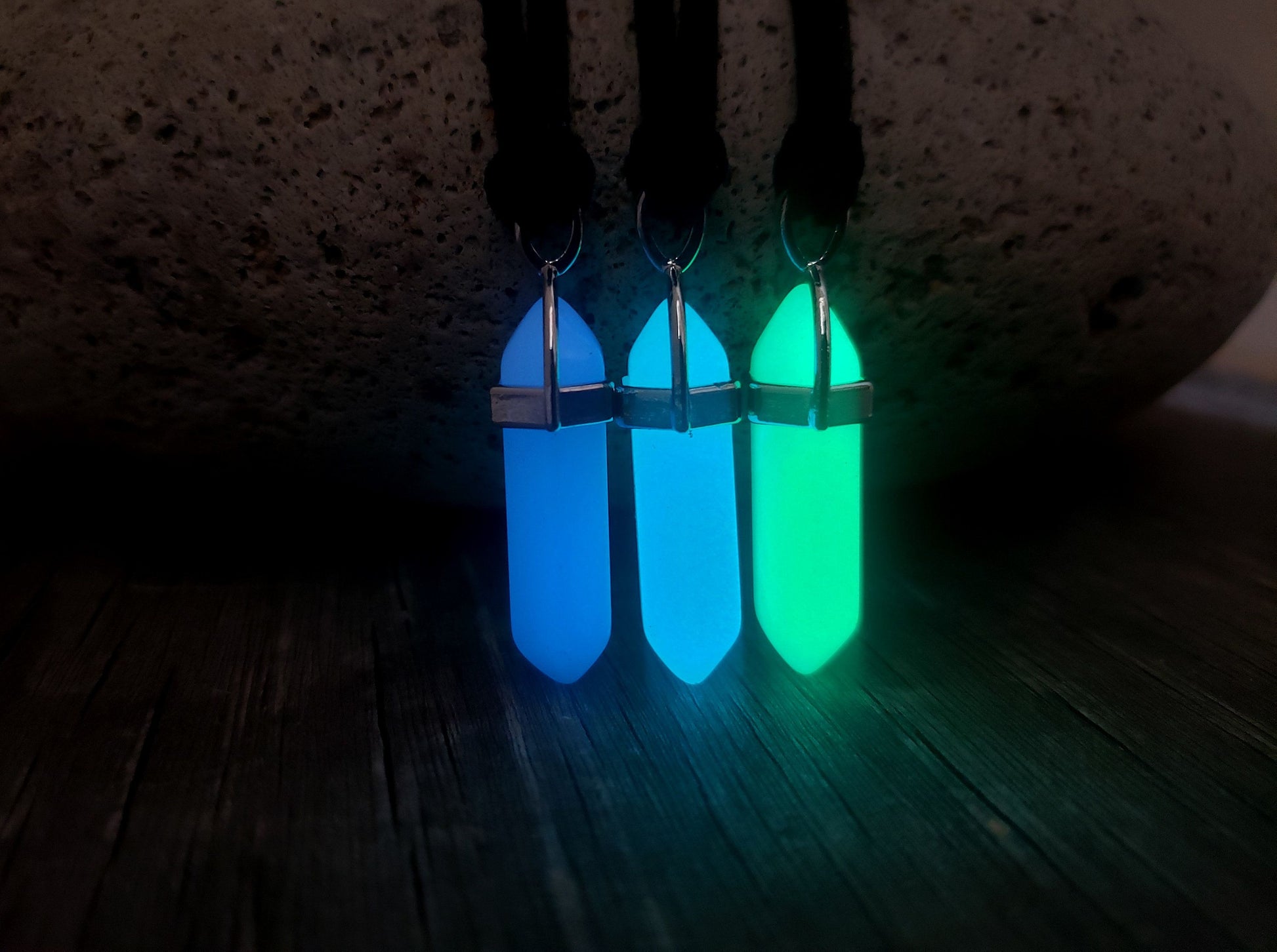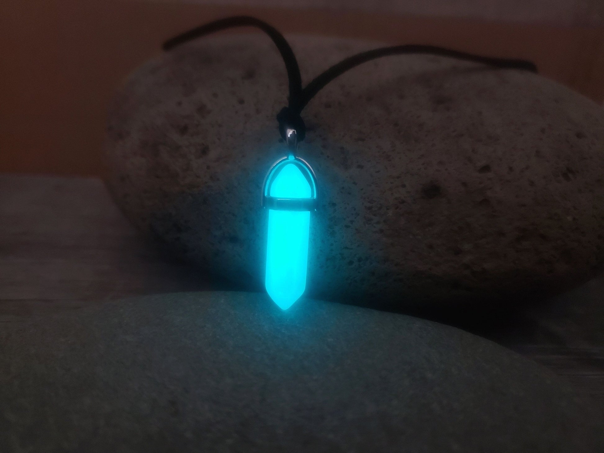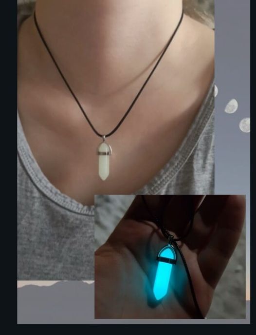 Para comprobar este efecto fluorescente puede dejar el collar expuesto a la luz del sol en una ventana durante un par de horas o luz de foco durante minutos y luego observarlo en una habitación oscura