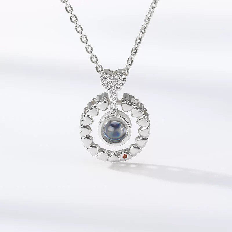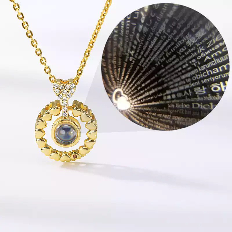 Descripción: Collar que proyecta la palabra «Te Amo» en 100 idiomas grabados a través de nano microcarving. ¡Puede verlo a través de cada lente de estándar de cámara / teléfono inteligente! Proyecta los mensajes en un fondo negro con la linterna de tu cámara para mostrar tu amor.