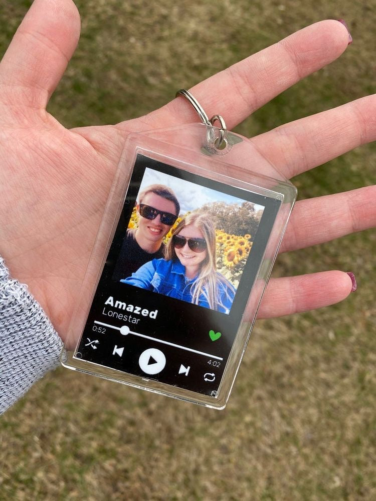 Presentamos la opción en llavero personalizado con diseño de pantalla de reproducción de Spotify para llevar siempre nuestra canción junto a nosotros.