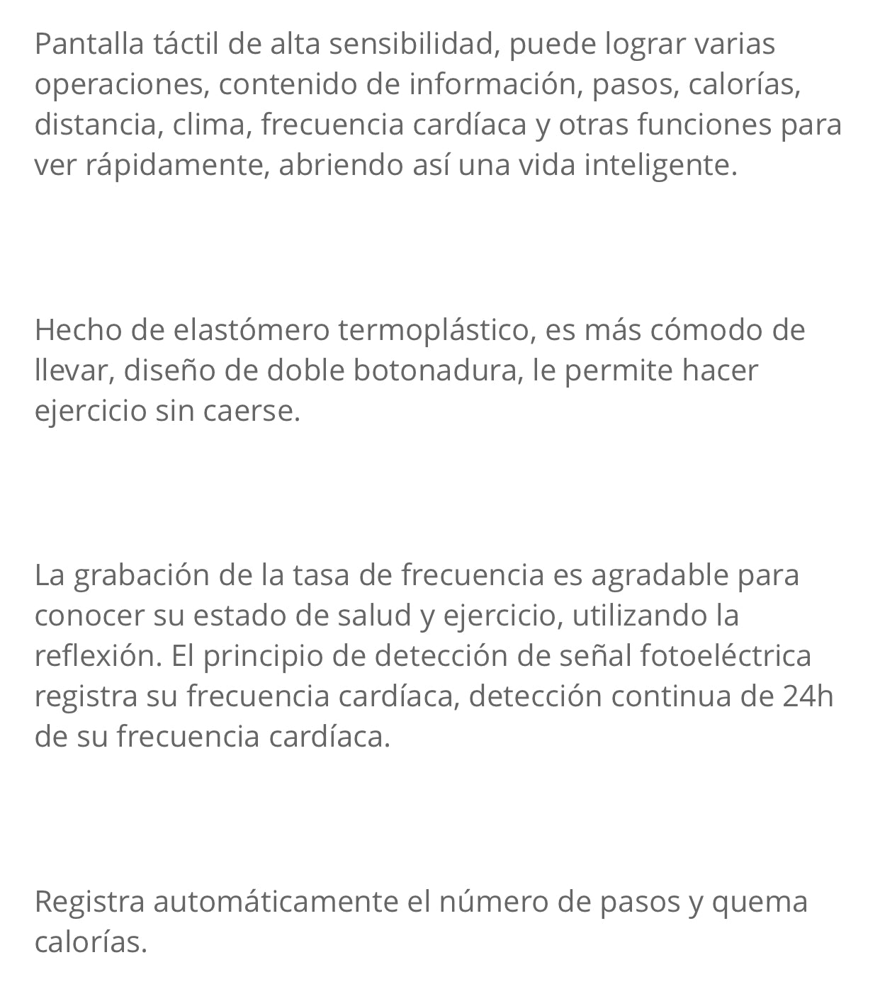 Pantalla táctil de alta sensibilidad, puede lograr varias operaciones, contenido de información, pasos, calorías, distancia, clima, frecuencia cardíaca y otras funciones para ver rápidamente, abriendo así una vida inteligente.