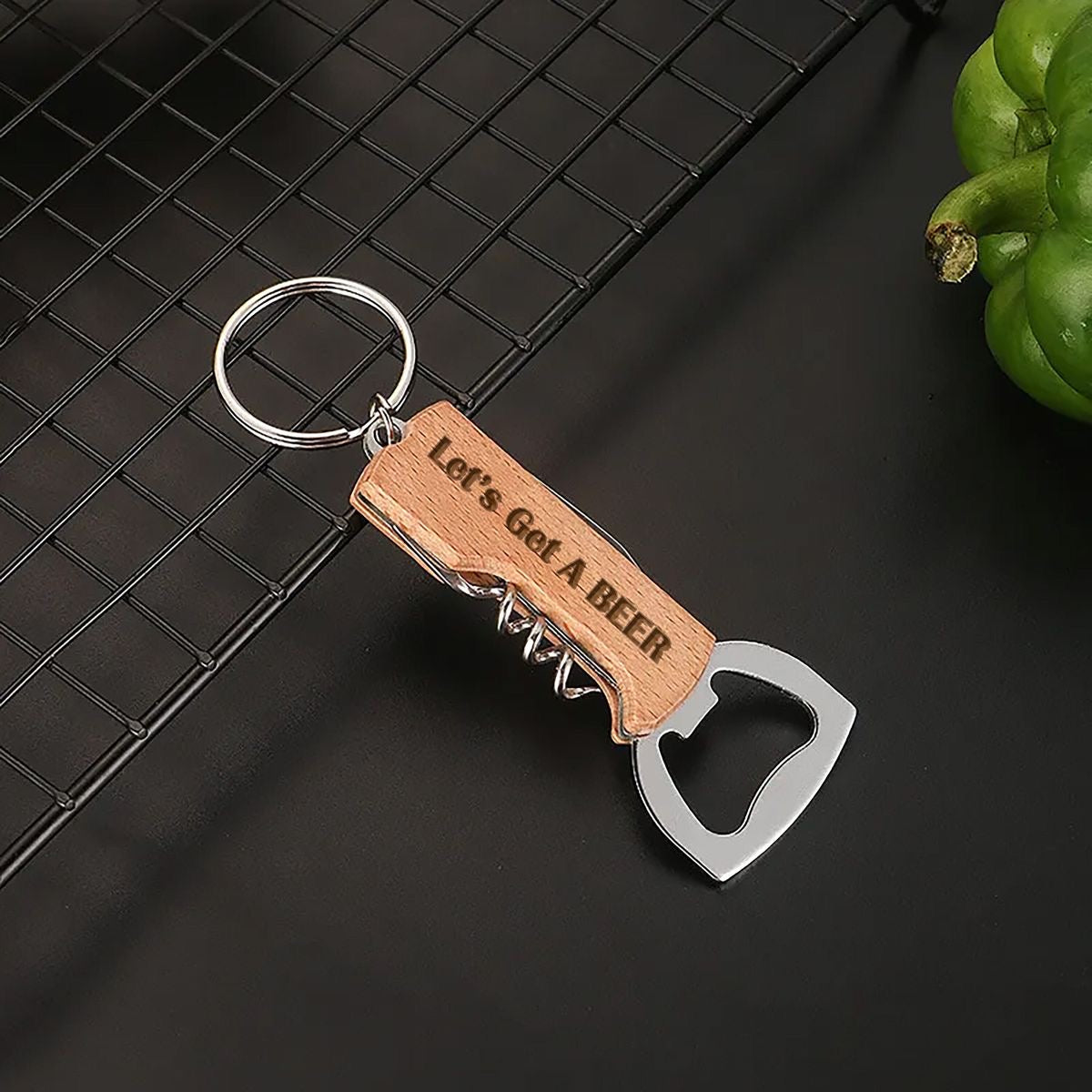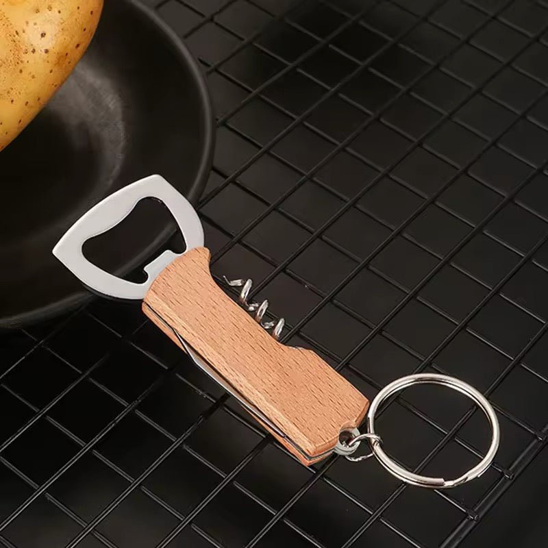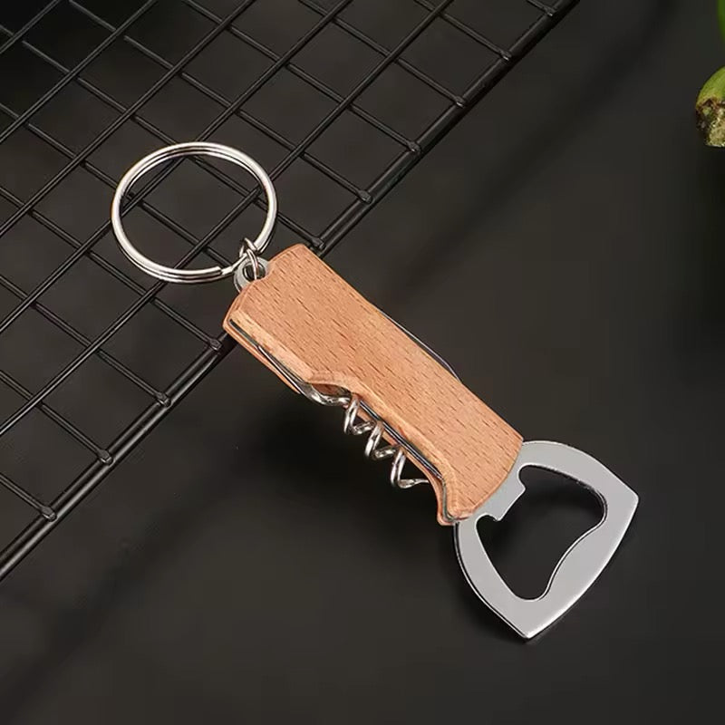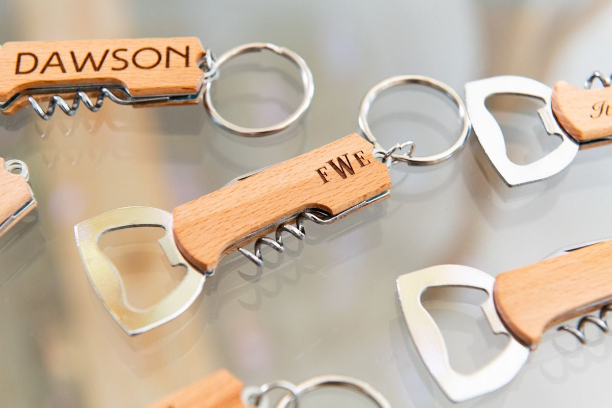 LLAVERO EN MADERA PERSONALIZADO ABRE CORCHOS Y BOTELLAS
