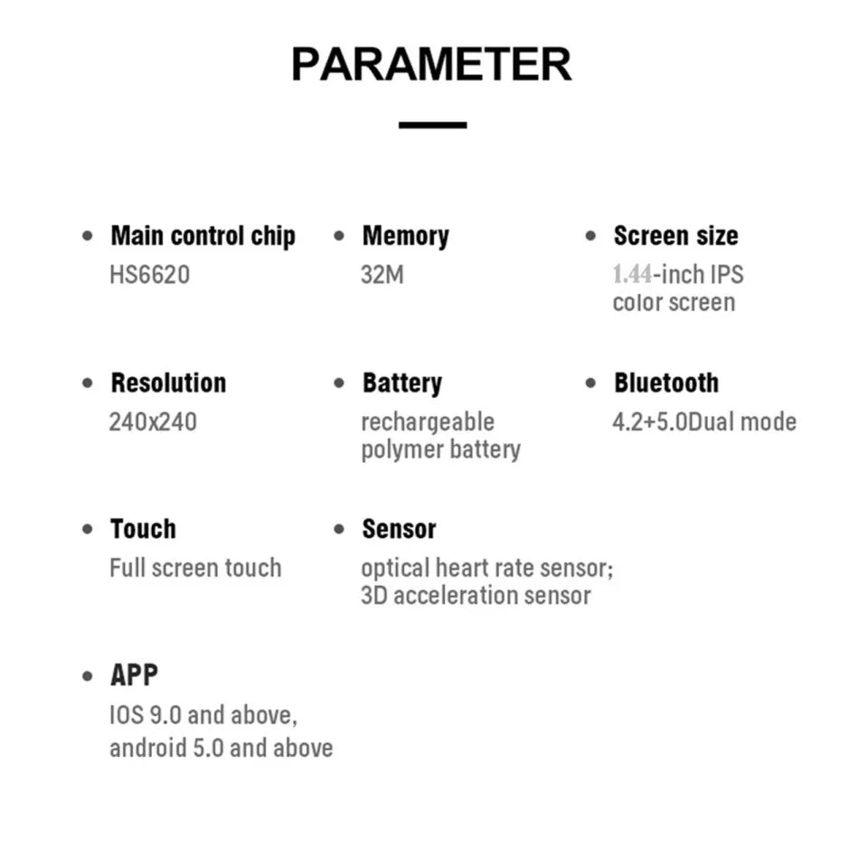 - Otros Funciones: pantalla brillante en la muñeca, modo no molestar, encontrar pulsera, Cámara remota, control de música, cronómetro, reloj despertador, ajuste de vibración